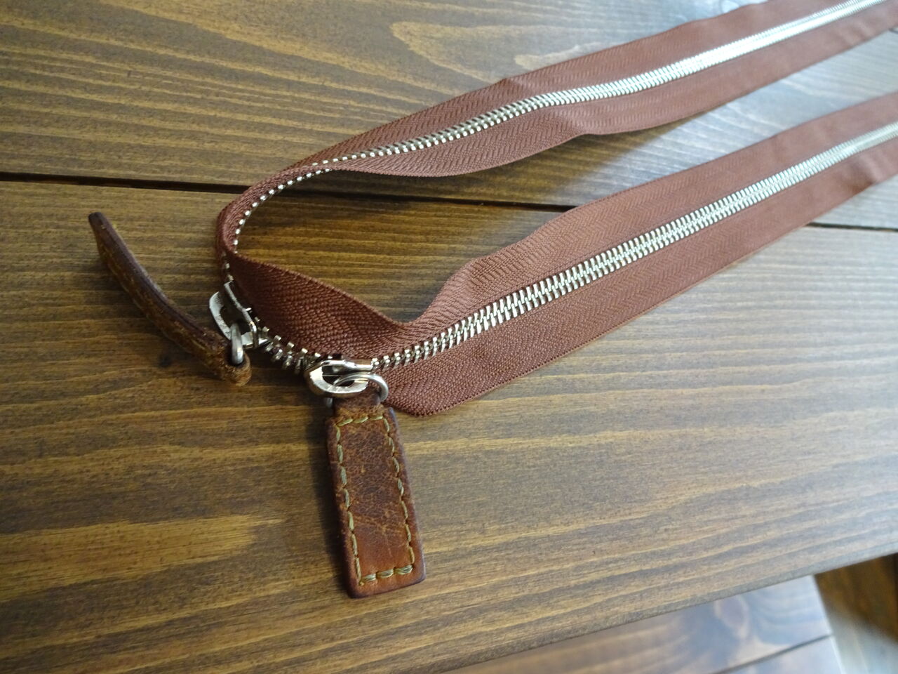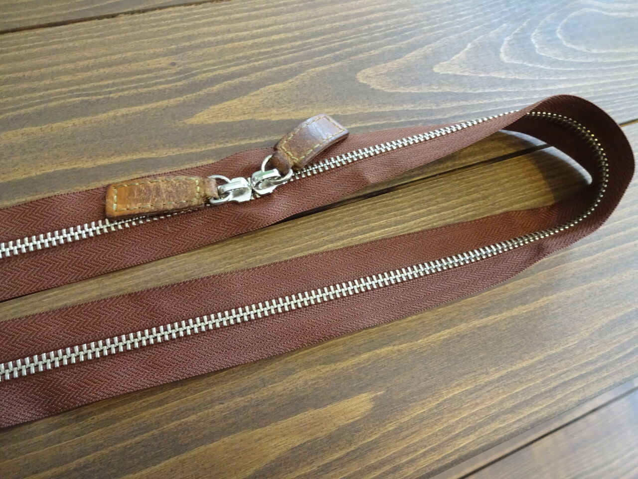 ・茶色のファスナーで、金具などはシルバー